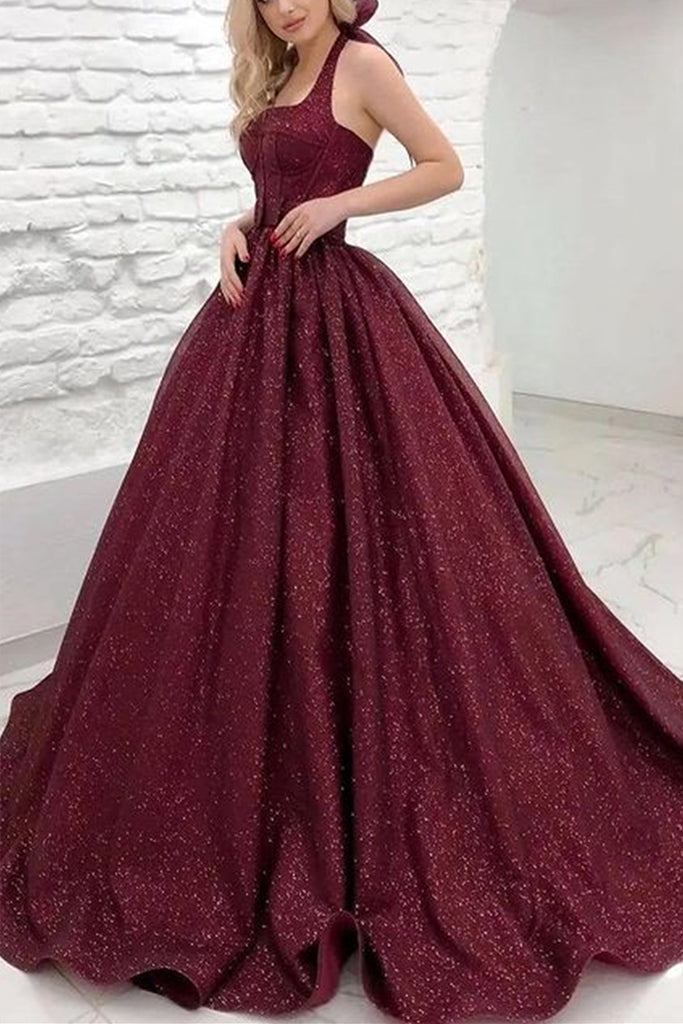 Glittery Burgundy Plunging Halter V Neck Prom Gown Xdressy